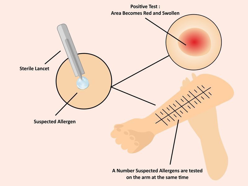 - Skin prick test: A small amount of allergen is placed on the skin, and a tiny prick is made through the droplet. If a person is allergic to the allergen, a raised bump or rash will appear on the skin.
